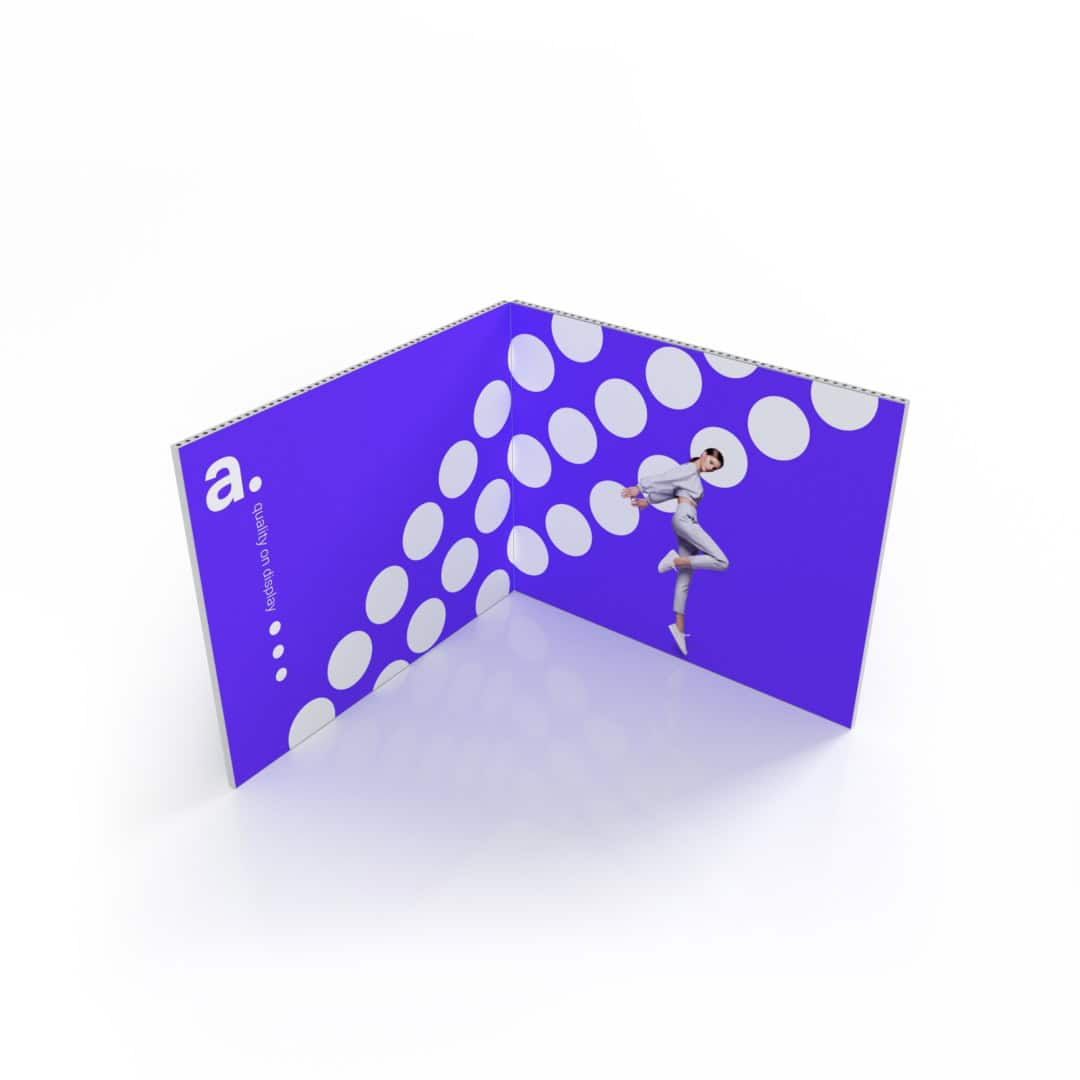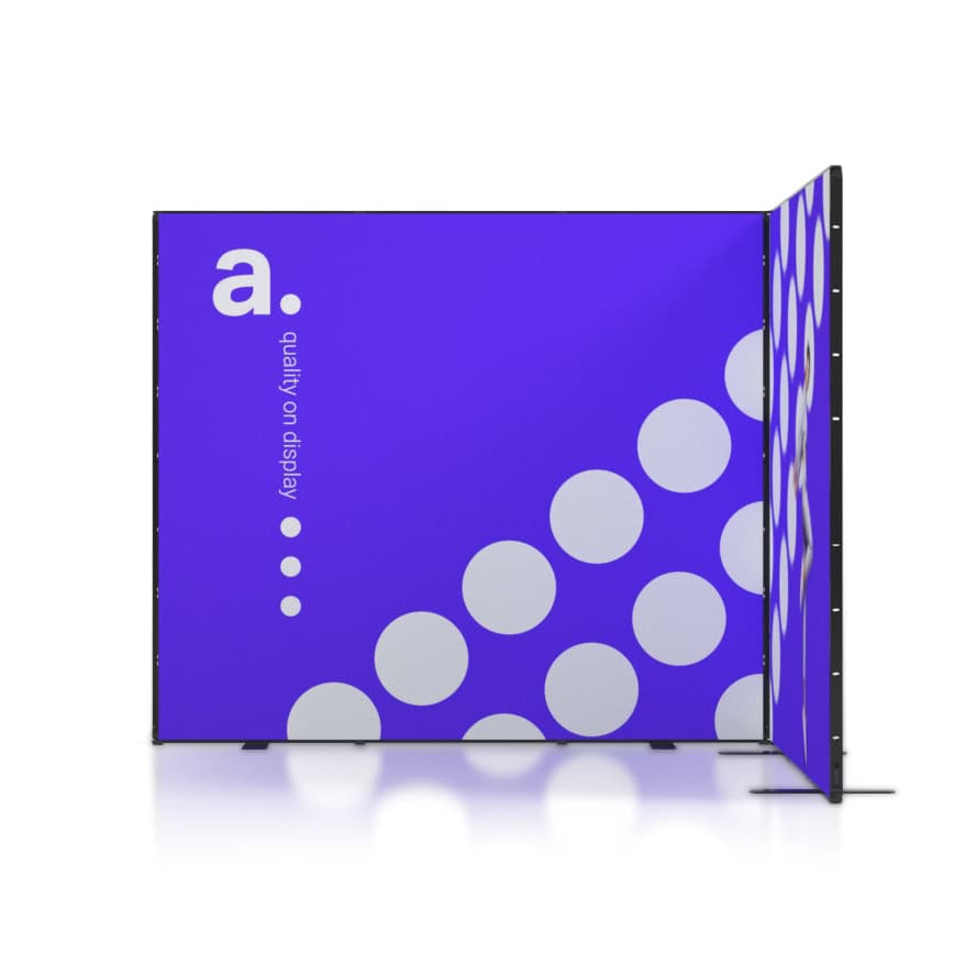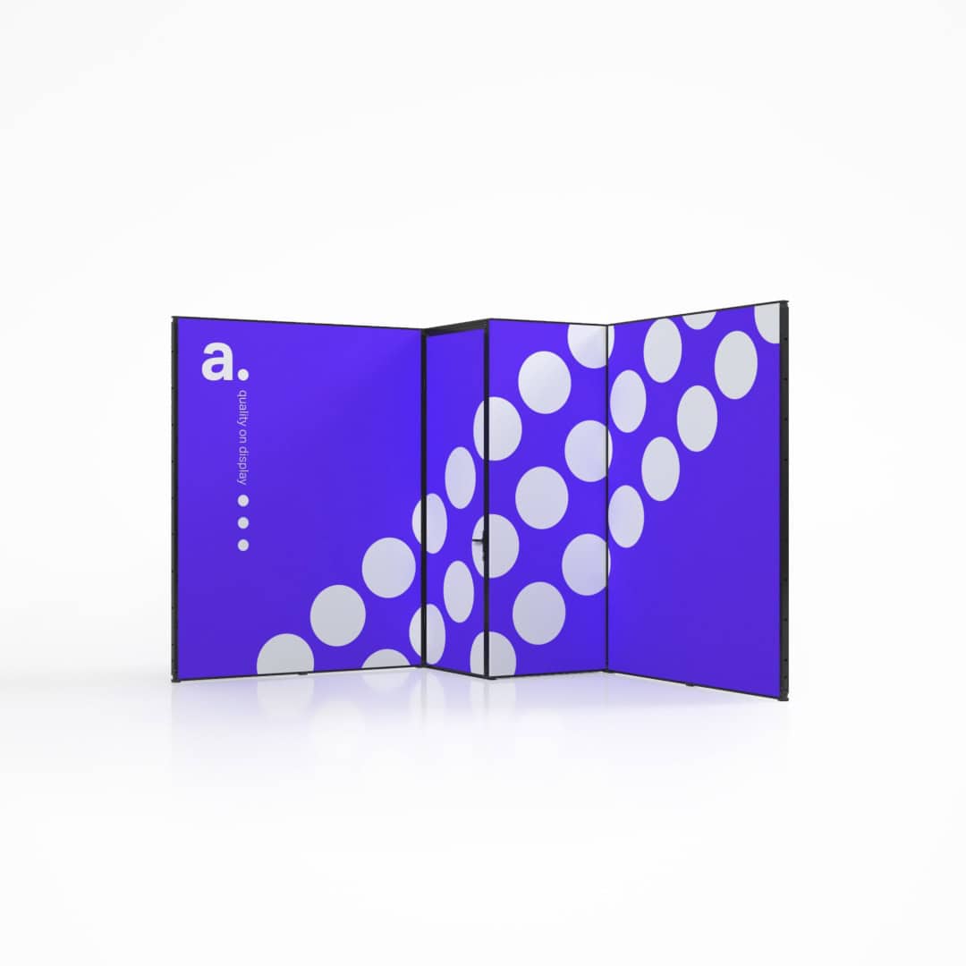 De wanden worden voorzien van blockout textielprints die licht volledig blokkeren, zodat uw visuals altijd strak en helder blijven. Door middel van sublimatiedruk worden kleuren intens weergegeven en details haarscherp afgedrukt. Bij een nieuwe campagne vervangt u eenvoudig alleen de prints, terwijl de aluminium constructie behouden blijft.