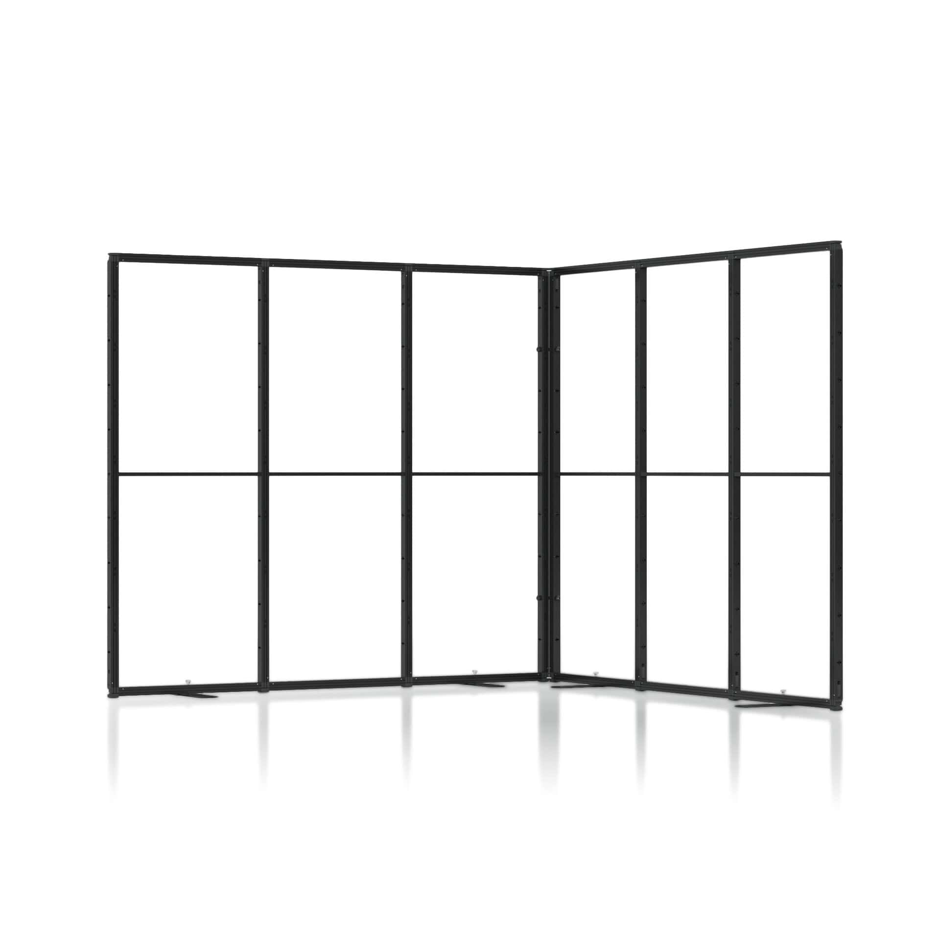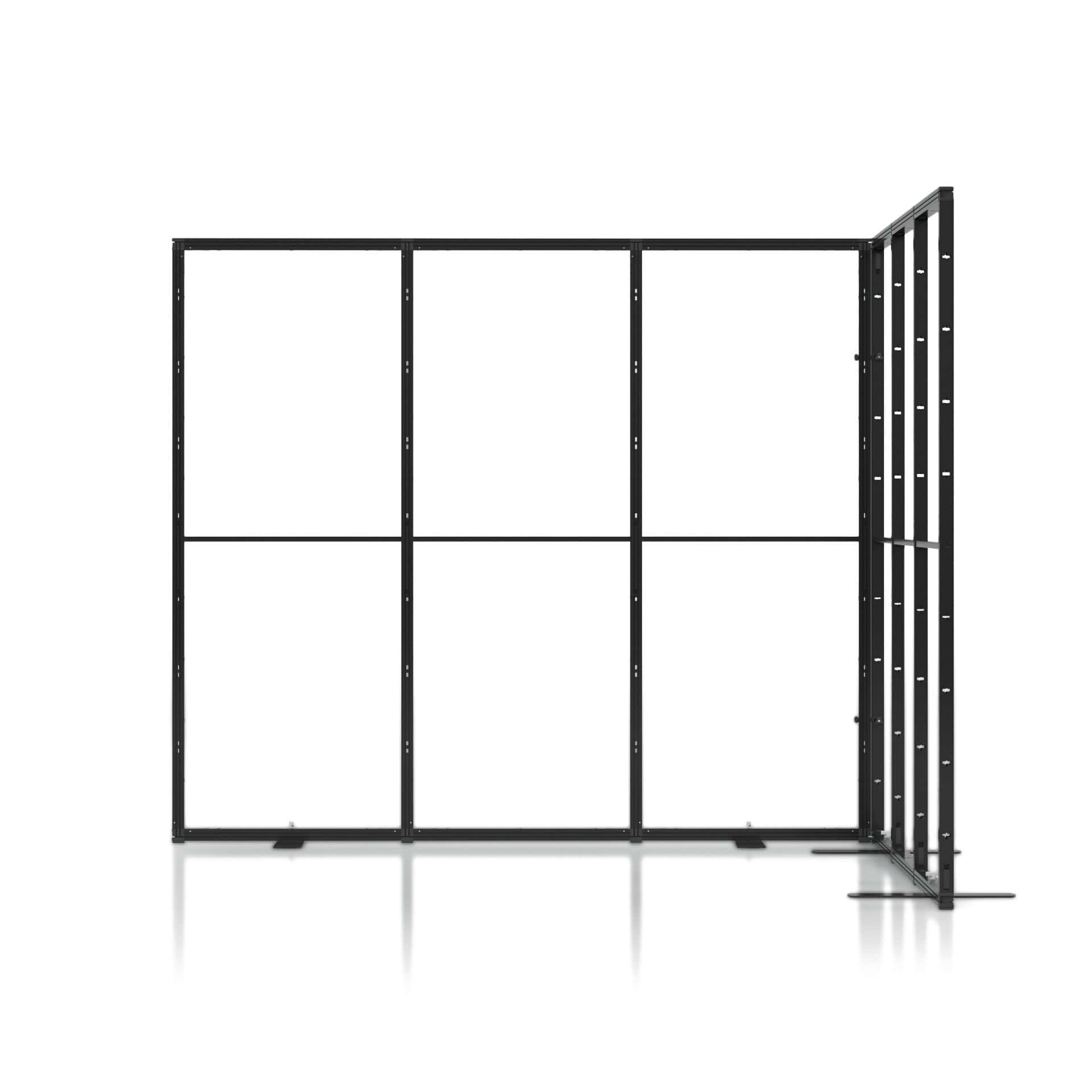 De Portable Modular Frames 3 × 3 meter hoekopstelling combineert extra vloeroppervlak met zichtbaarheid vanaf twee zijden. Verkrijgbaar in 250, 300 of 350 cm hoogte en optioneel met pantry, biedt deze modulaire beursstand flexibiliteit, hergebruik en een professionele uitstraling voor iedere beursdeelname.