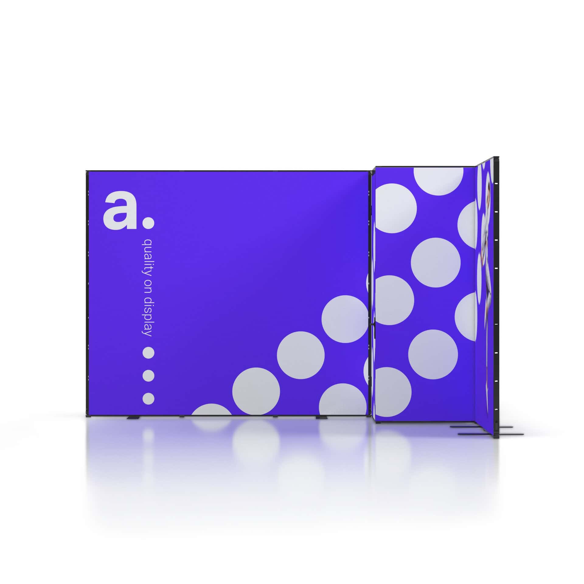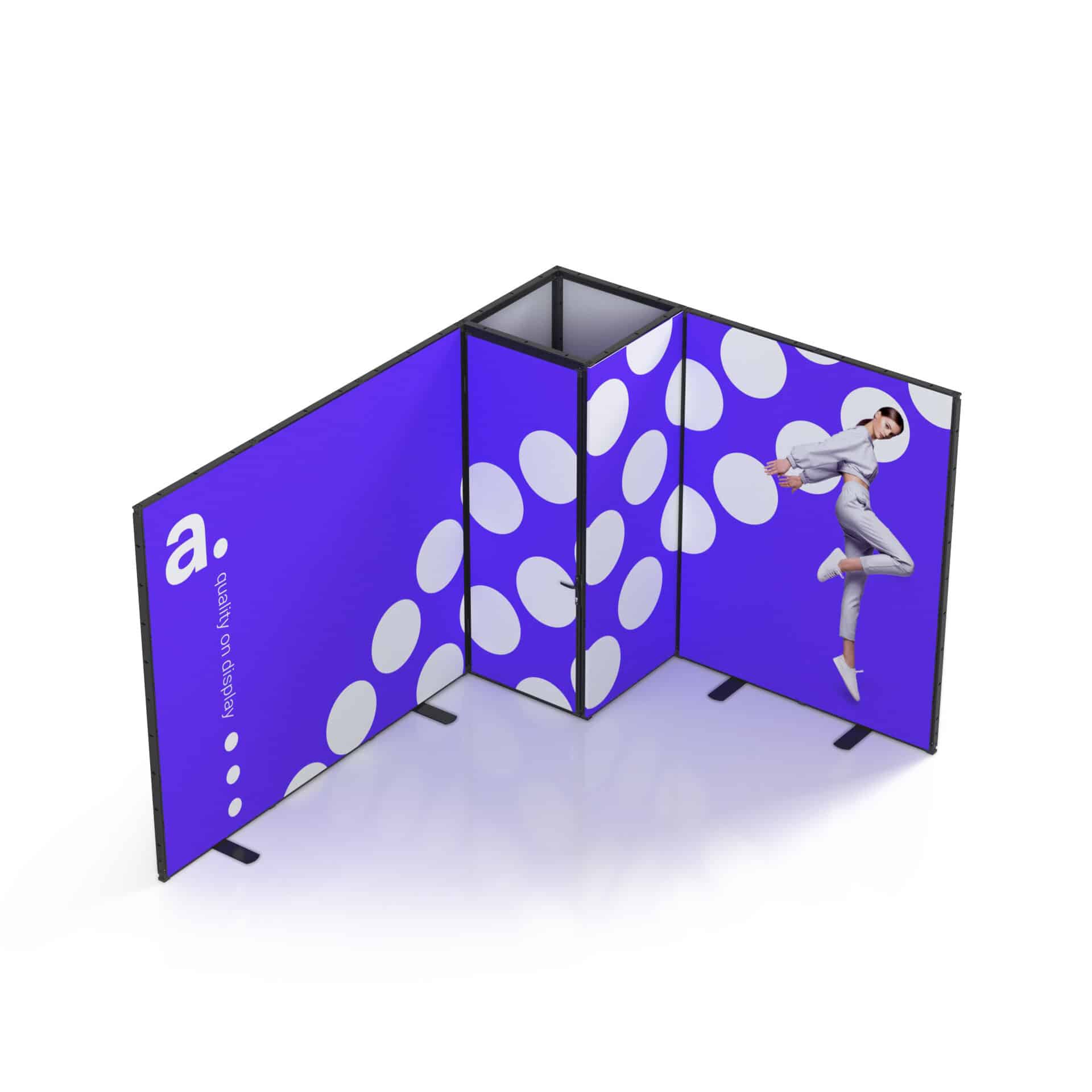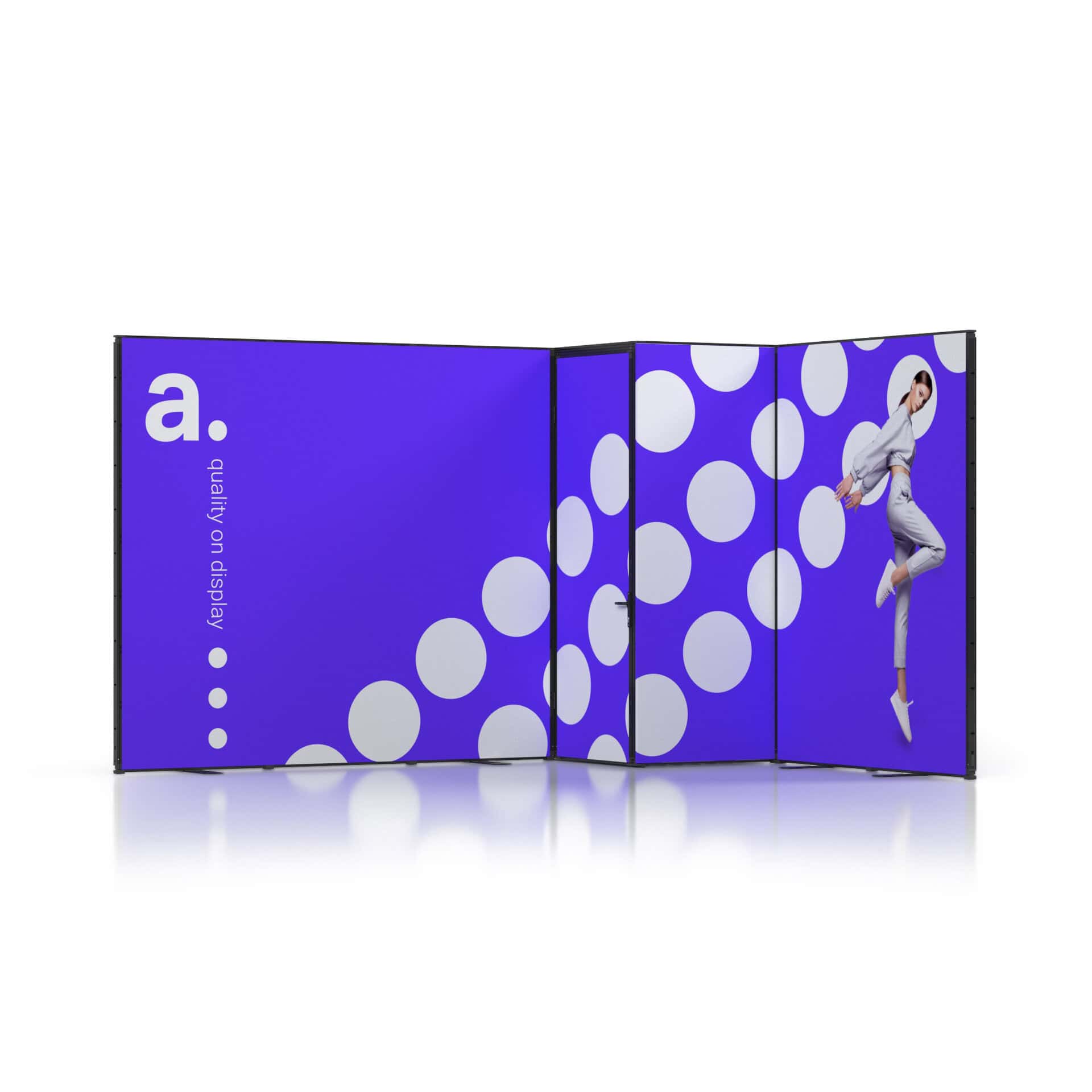 De wanden worden afgewerkt met blockout textielprints die licht volledig blokkeren, zodat uw visuals helder en professioneel blijven. Dankzij sublimatiedruk worden kleuren intens weergegeven en details scherp afgedrukt. Bij een nieuwe campagne vervangt u eenvoudig de prints, terwijl de aluminium constructie behouden blijft.