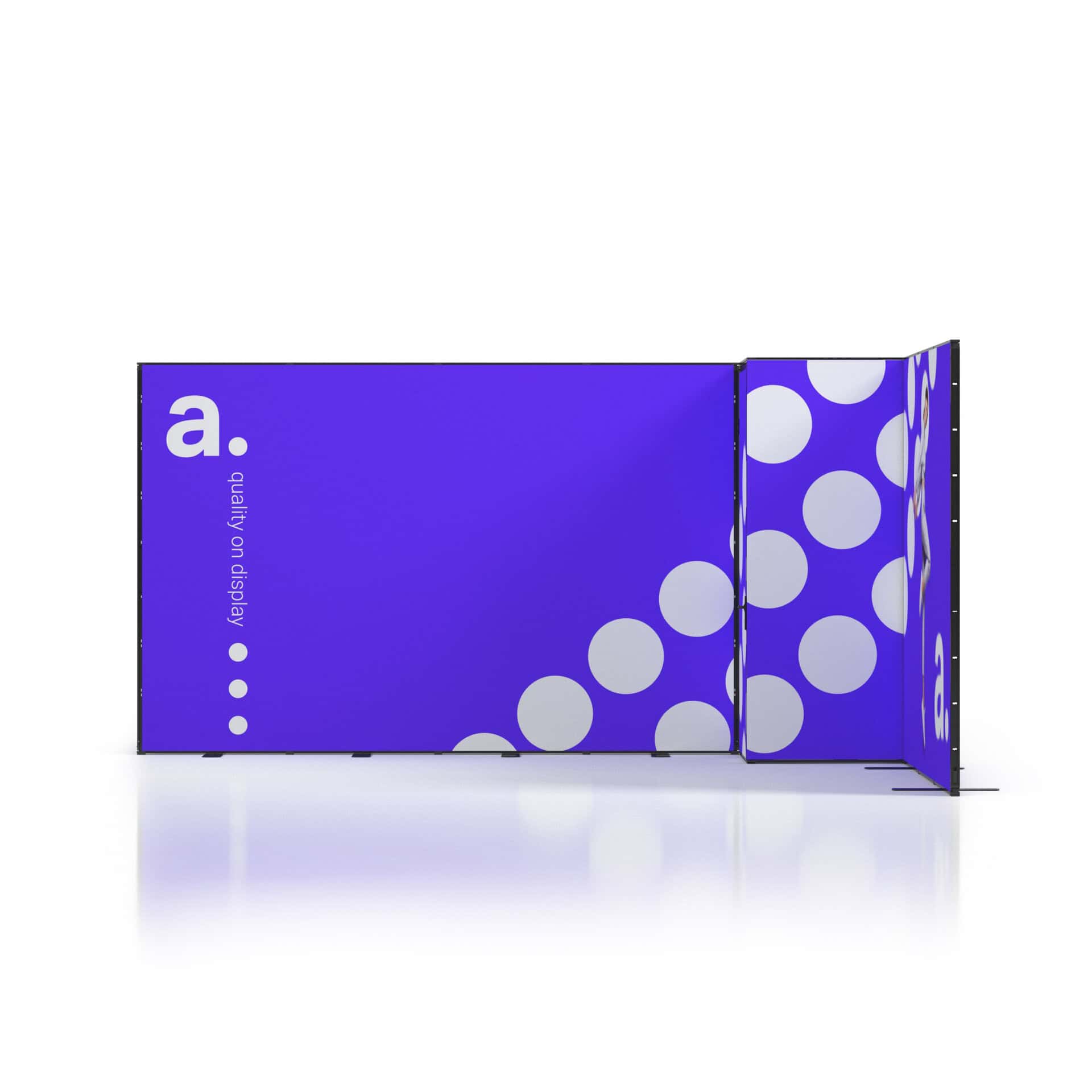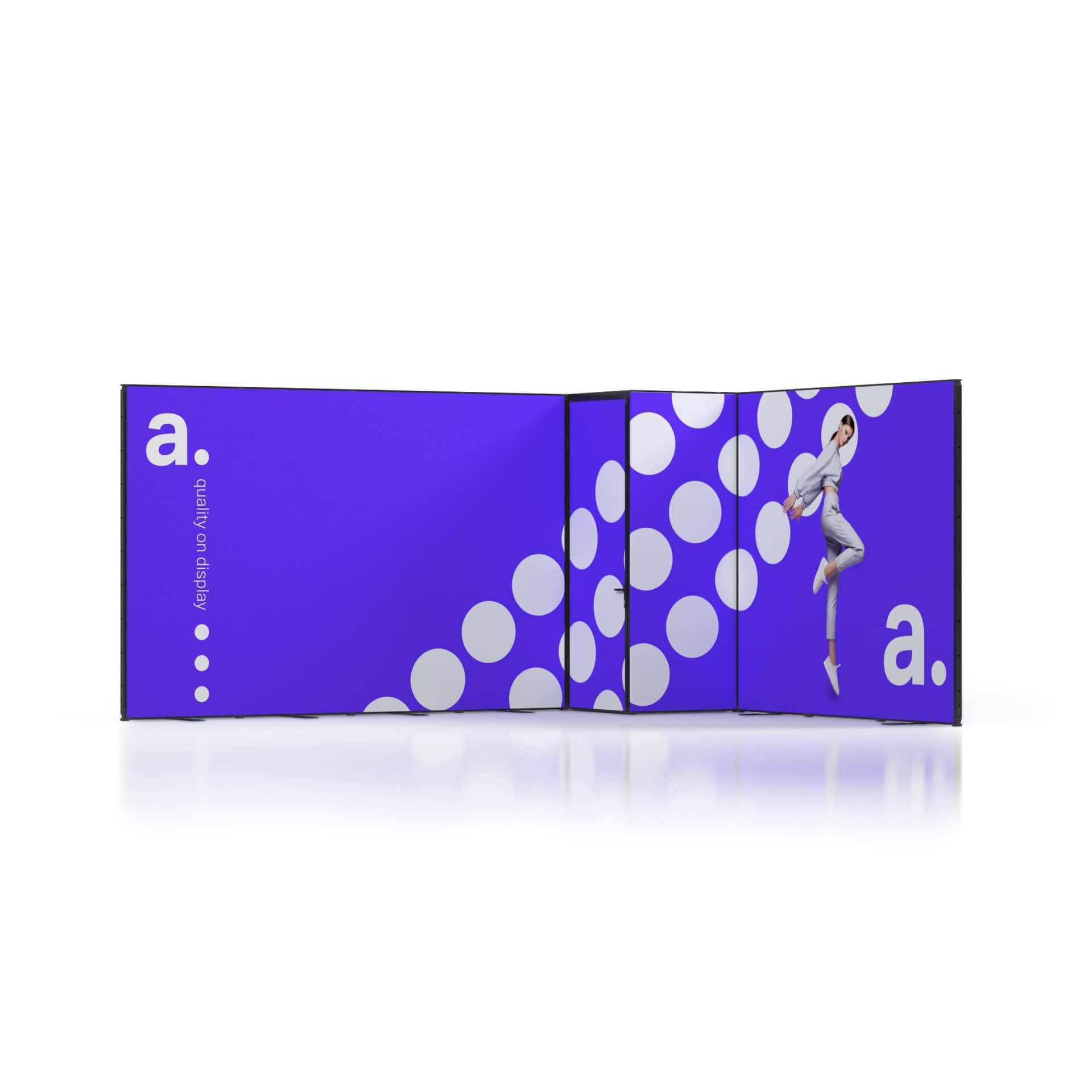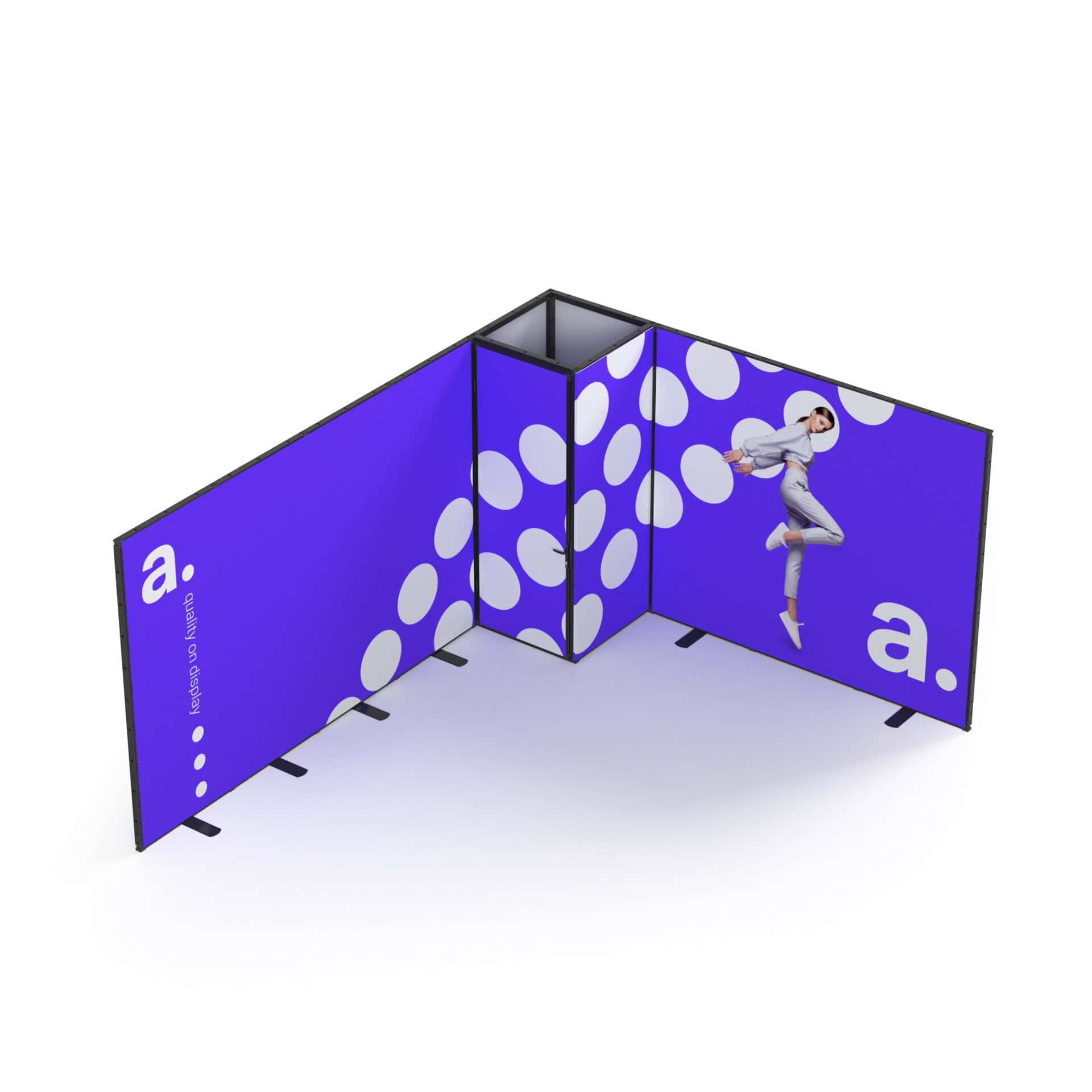 De wanden worden afgewerkt met blockout textielprints die licht volledig blokkeren, zodat uw visuals altijd helder en krachtig blijven. Door middel van sublimatiedruk worden kleuren intens en details scherp weergegeven. Bij een nieuwe campagne vervangt u eenvoudig de prints, terwijl de constructie behouden blijft.