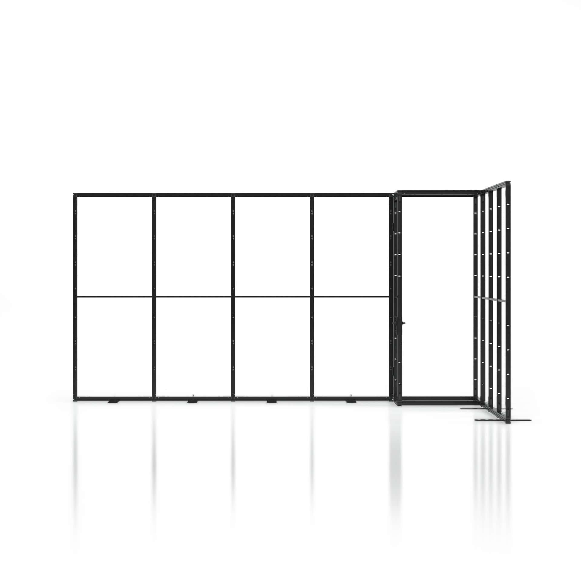 De Portable Modular Frames 5 × 4 meter hoekopstelling biedt een ruime beursstand met twee open zijden en standaard geïntegreerde pantry. Verkrijgbaar in 250, 300 of 350 cm hoogte combineert deze modulaire en herbruikbare oplossing maximale zichtbaarheid met extra functionaliteit en comfort.